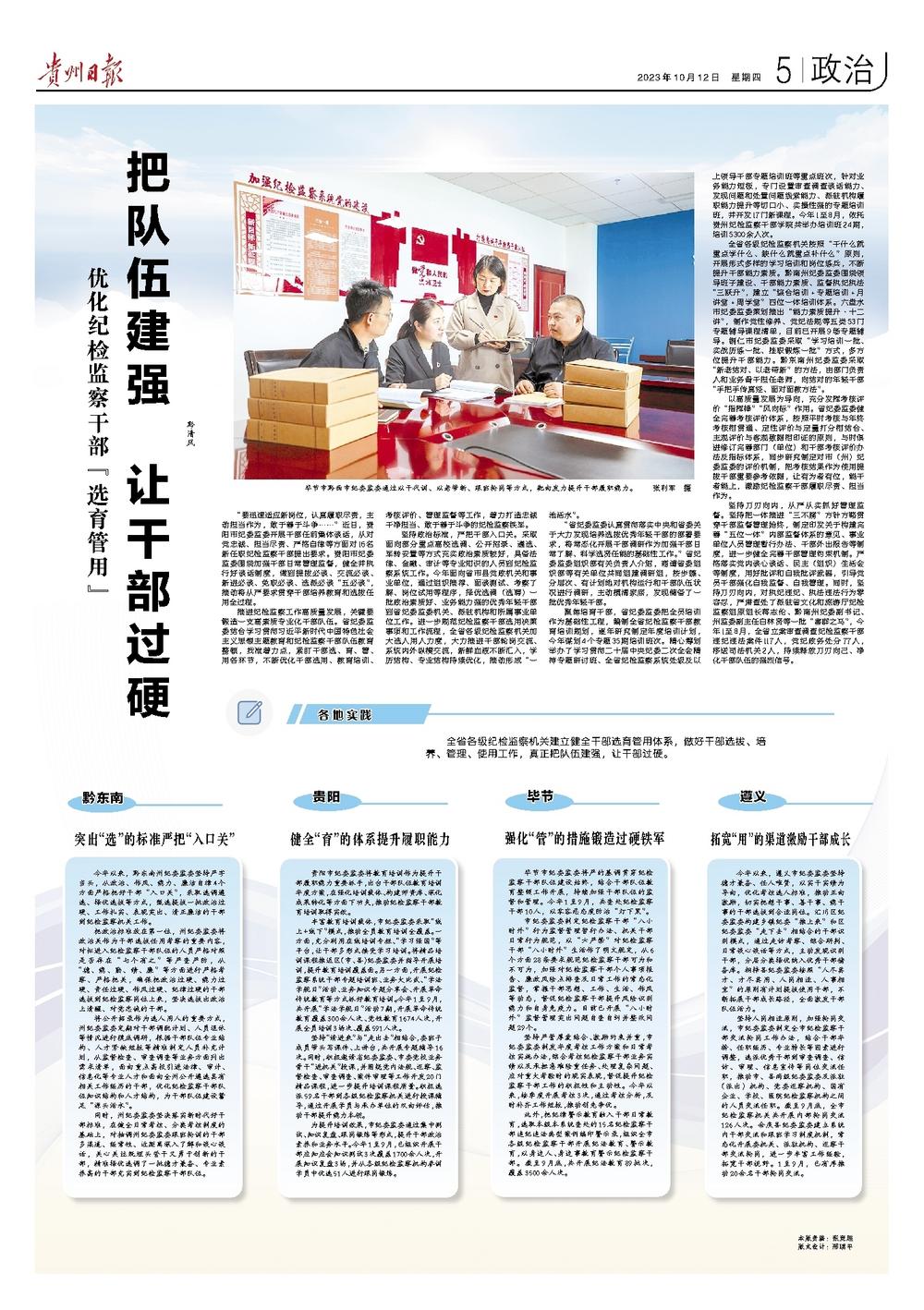 《贵州日报》头版、“党风廉政”专版丨 优化纪检监察干部“选育管用” 把队伍建强 让干部过硬