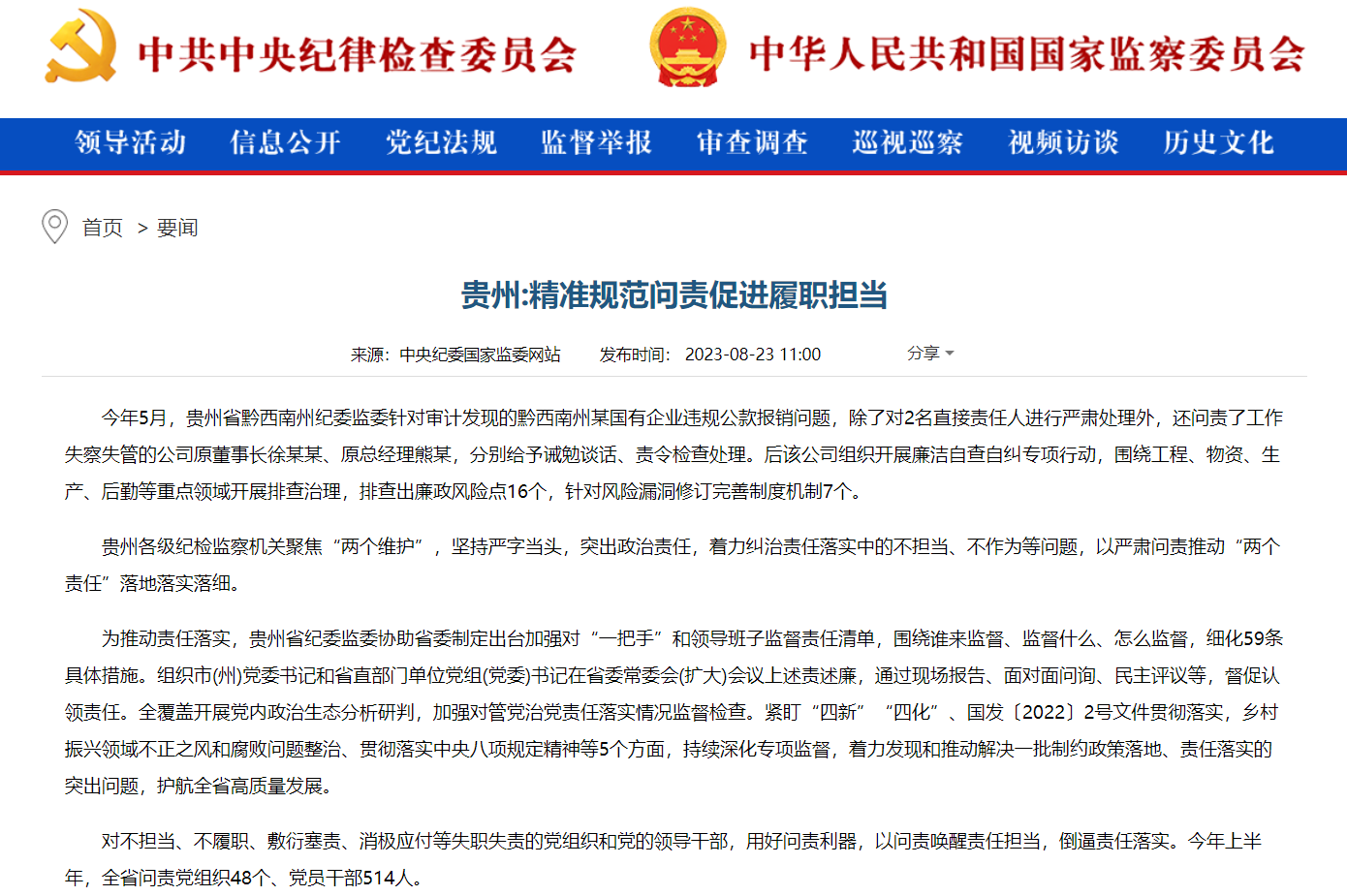 为确保问责精准、规范,贵州省纪委监委结合工作实际,协助省委制定出台贵州省问责工作操作规范,细化完善省纪委监委机关问责工作流程,明确问责的启动、调查、决定以及成果运用等一般性程序。统筹组织实施全省纪检监察机关问责工作质量评查,查找发现不精准、不规范问题,督促全省纪检监察机关举一反三抓好整改。同时,推动评查成果转化,制定印发纪检监察机关问责工作易错清单,从问责对象、事实证据、责任认定、条规适用等13个方面细化了48种问责易错情形,避免问责泛化、简单化。