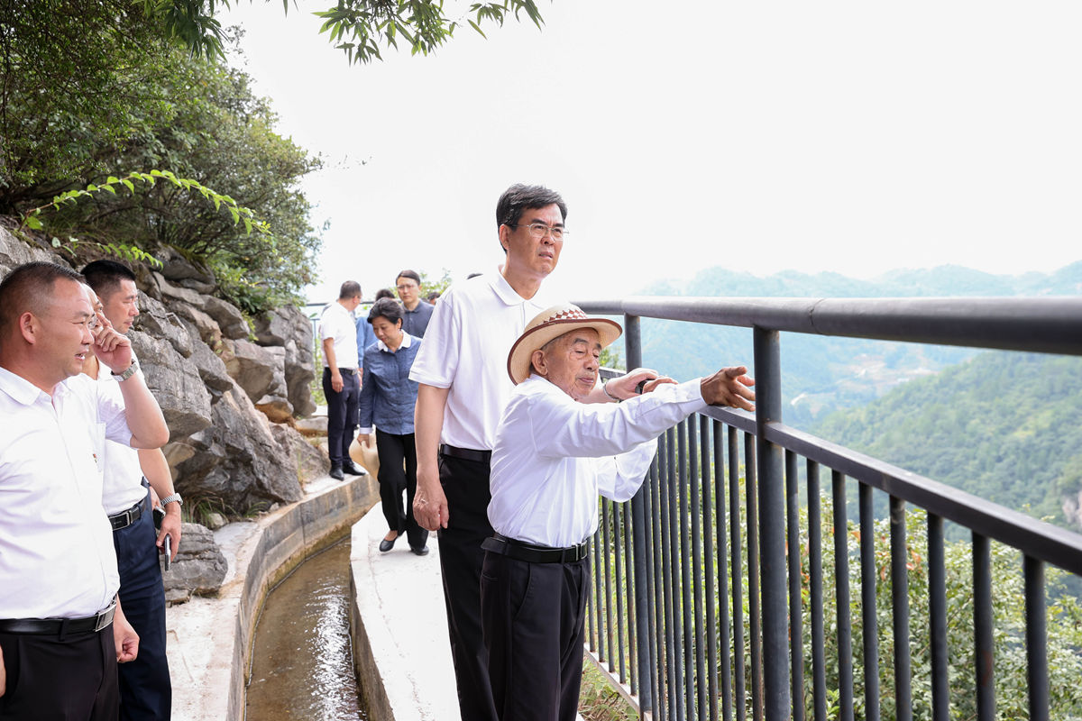 李炳军到播州区平正乡团结村参观大发渠,与黄大发同志沿着水渠边走边聊,详细了解当年修渠的感人事迹。