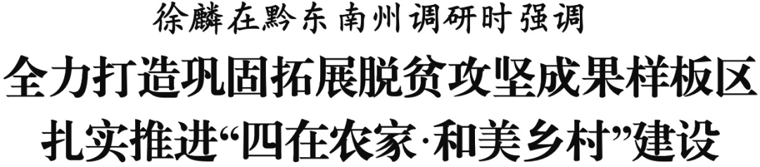 调研期间,徐麟主持召开座谈会,听取黔东南州和榕江县、黎平县、从江县乡村振兴工作情况汇报,对黔东南州工作给予肯定。他强调,黔东南州要把巩固拓展脱贫攻坚成果作为“国之大者”“民之大事”来抓,围绕工作目标,加强动态监测帮扶,抓好脱贫群众增收,深化易地扶贫搬迁后续扶持,深化东西部协作,坚决守住不发生规模性返贫的底线。要以“四在农家·和美乡村”为载体,在乡村产业上求突破,在乡村旅游上走前列,在乡村文化上创品牌,在乡村建设上显特色,在乡村治理上做示范,全力做好乡村振兴这篇大文章。要大力推进人才振兴和组织振兴,把党的领导贯穿乡村振兴工作各方面全过程,全面落实乡村振兴责任制,健全村党组织领导的村级组织体系,切实增强党组织政治功能、组织功能,为推进乡村振兴提供坚强保障。