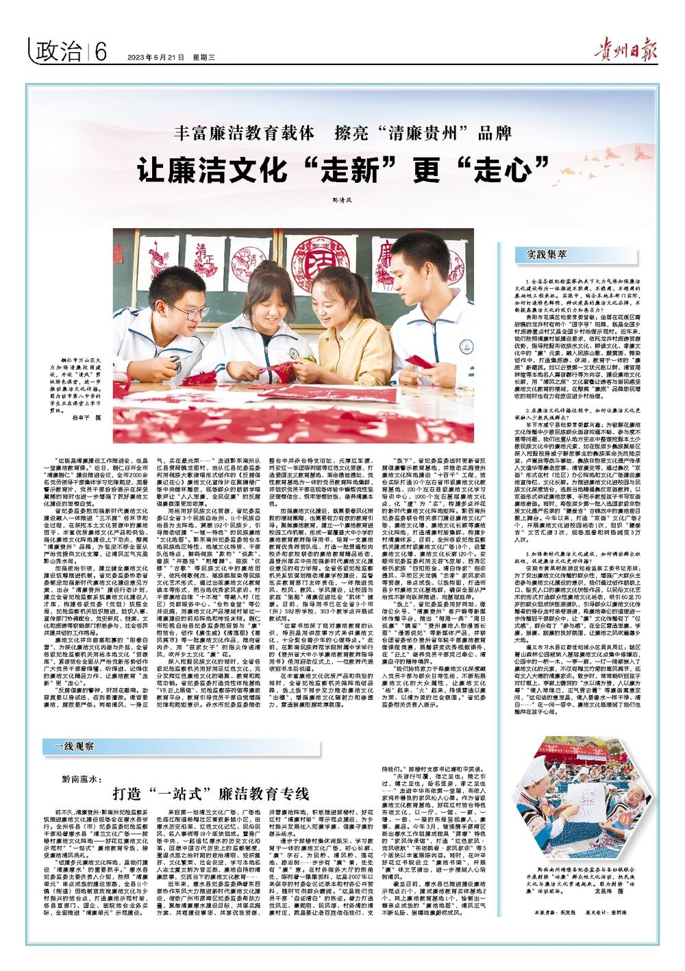 《贵州日报》头版、“党风廉政”专版|丰富廉洁教育载体 擦亮“清廉贵州”品牌 让廉洁文化“走新”更“走心”