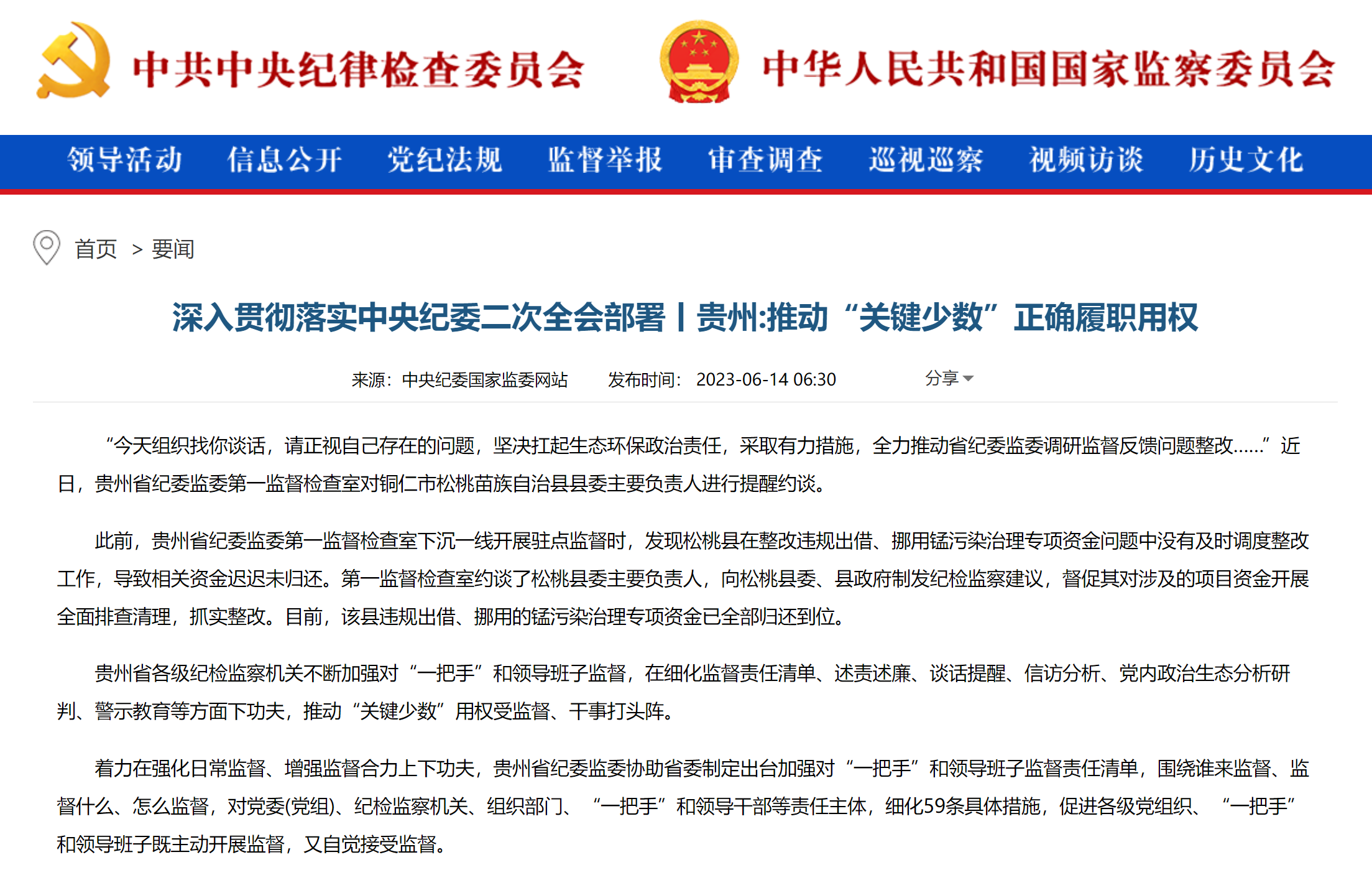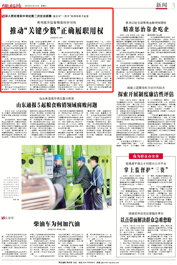 《中国纪检监察报》“新闻”版头条、中央纪委国家监委网站| 贵州提升监督精准性针对性 推动“关键少数”正确履职用权