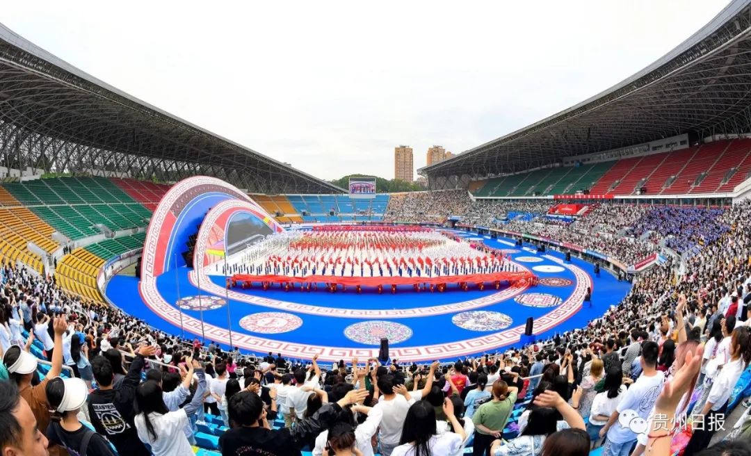 贵阳奥体中心体育场内气氛热烈。入场仪式前,开幕式演出《序篇:黔山秀水迎客来》营造了喜庆的现场氛围,表达了贵州各族儿女张开双臂拥抱新时代、礼迎天下贵客的喜悦之情。