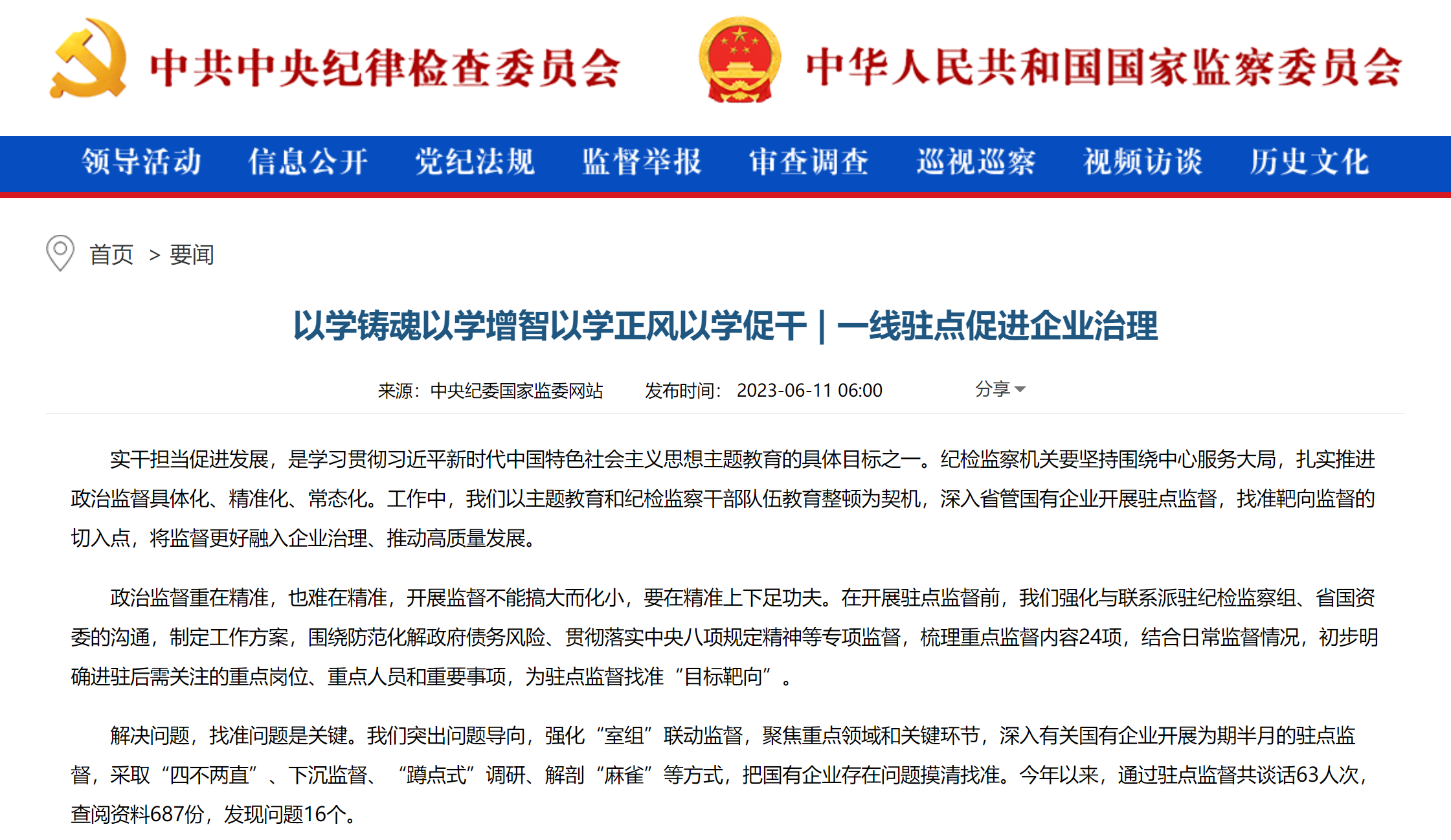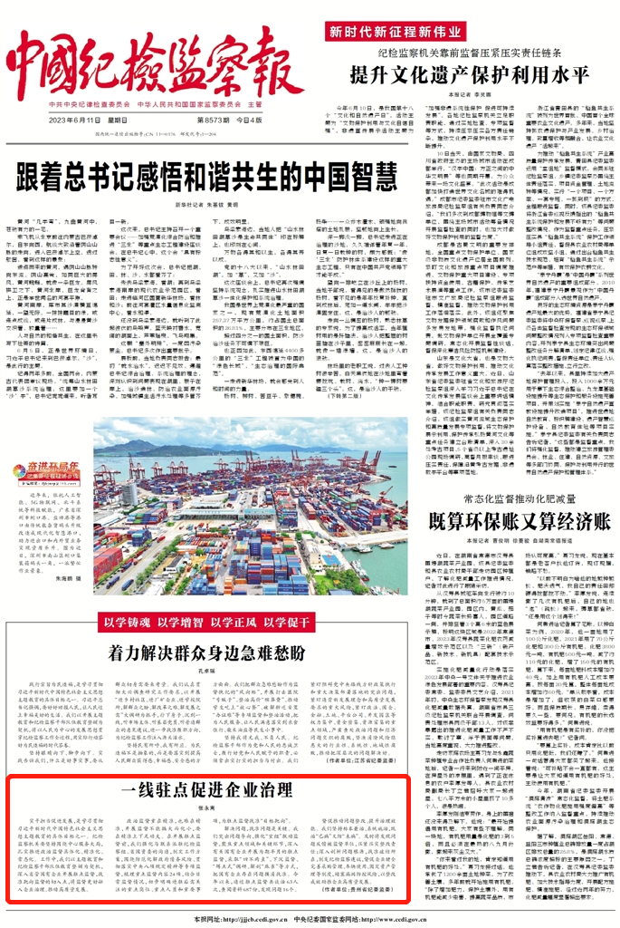 《中国纪检监察报》头版、中央纪委国家监委网站丨一线驻点促进企业治理