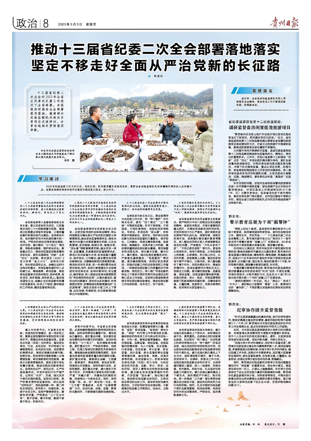 《贵州日报》头版、“党风廉政”专版| 推动十三届省纪委二次全会部署落地落实 坚定不移走好全面从严治党新的长征路