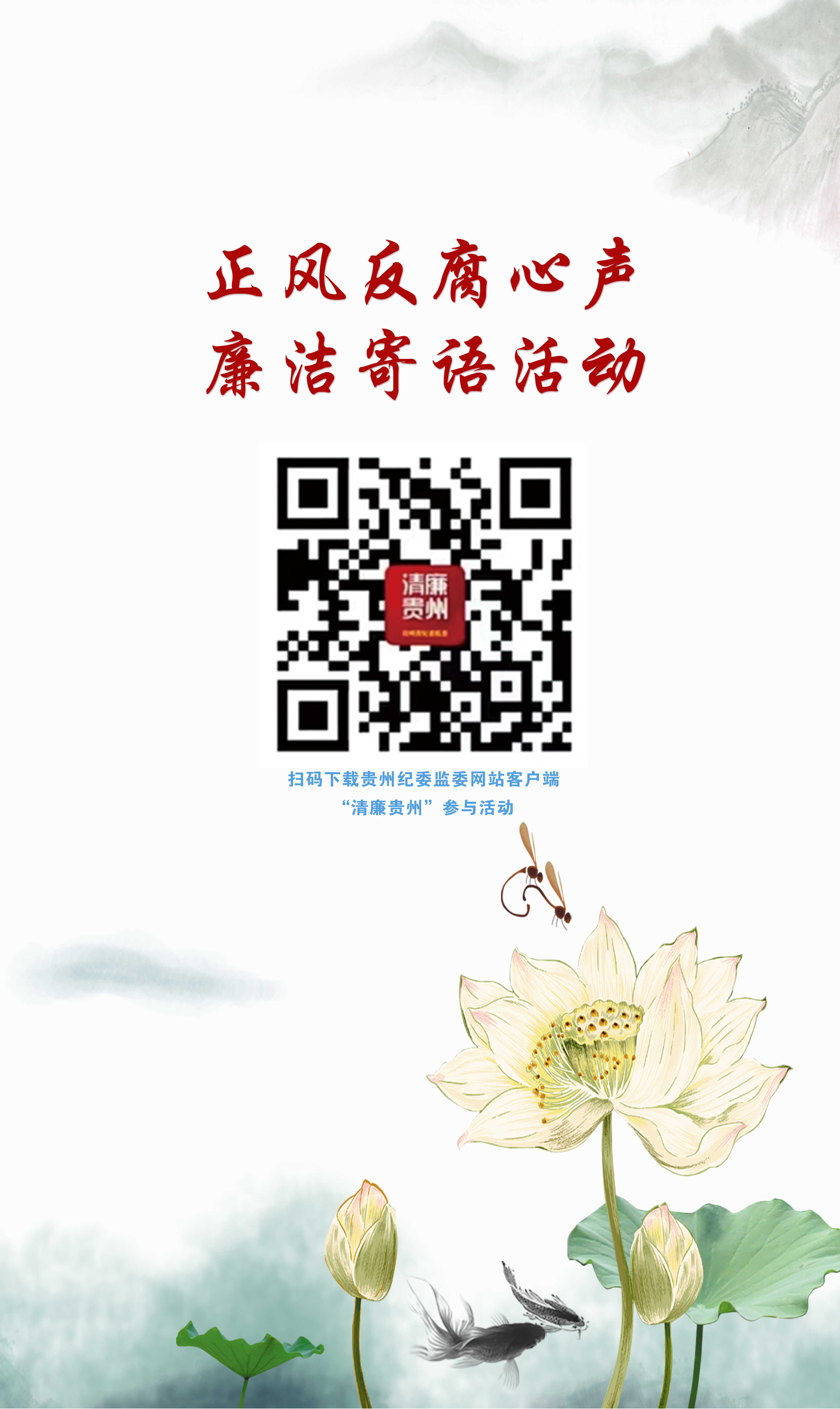 1月1日至15日,贵州省纪委监委网站客户端“清廉贵州”开展“正风反腐心声”廉洁寄语活动,邀请您挥笔抒怀、话廉赠言、寄语共勉。赶快拿起手机扫描二维码,通过点击下载贵州省纪委监委网站客户端“清廉贵州”参与活动吧!
