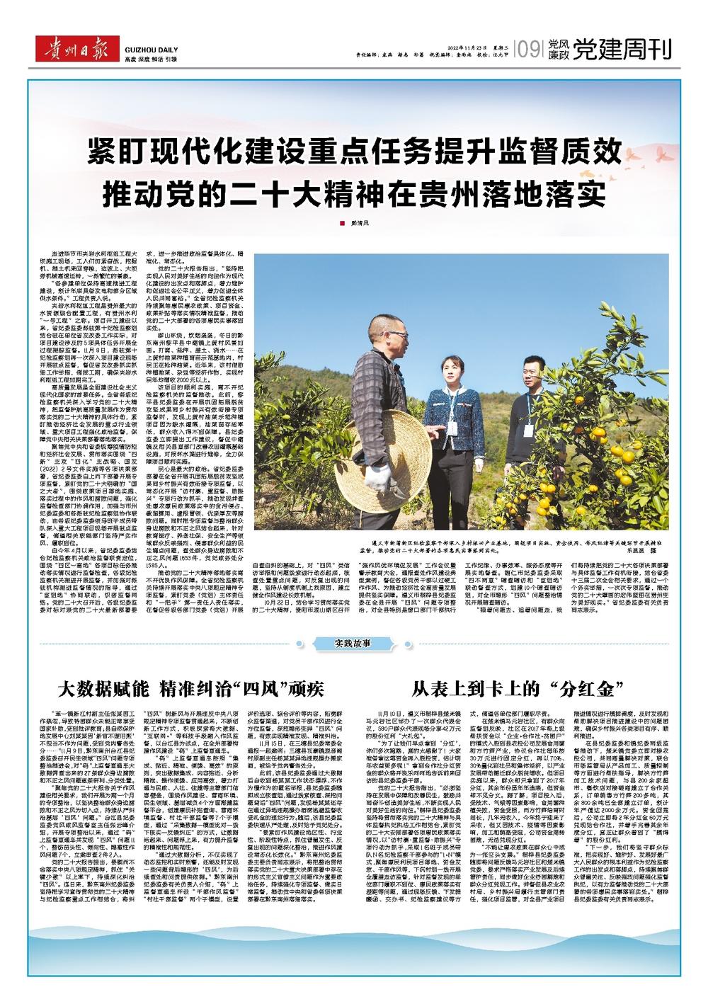 《贵州日报》头版、“党风廉政”专版|紧盯现代化建设重点任务提升监督质效 推动党的二十大精神在贵州落地落实