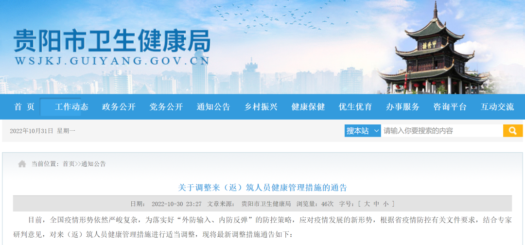 目前,全国疫情形势依然严峻复杂,为落实好“外防输入、内防反弹”的防控策略,应对疫情发展的新形势,根据省疫情防控有关文件要求,结合专家研判意见,对来(返)筑人员健康管理措施进行适当调整,现将最新调整措施通告如下:一、所有省外来(返)筑人员须提前通过“贵州健康码”小程序进行个人健康申报,并持48小时内核酸检测阴性证明有序入筑;同时,要主动向所在社区(村居)或居住酒店、所在单位或走访接待单位进行报备。(一)对7天内有新疆维吾尔自治区、内蒙古自治区、青海省、甘肃省、福建省福州市疫情重点地区旅居史的来(返)筑人员,实行“3天集中隔离+4天居家健康监测+5次核酸检测(分别在第1、2、3、5、7天)+1次抗原检测”健康管理措施。(二)对7天内有西藏自治区、陕西省西安市和汉中市、山西省大同市和太原市、湖南省邵阳市和怀化市、湖北省武汉市和宜昌市、河南省郑州市、河北省张家口市和保定市、黑龙江省黑河市和绥化市、山东省枣庄市、广东省广州市和佛山市、福建省南平市、四川省广元市和南充市、云南省德宏州、重庆市永川区疫情地区旅居史的来(返)筑人员,实行“3天居家健康监测+4天自我健康监测+5次核酸检测(分别在第1、2、3、5、7天)”健康管理措施。居家健康监测期间,实行“黄码”管理,原则上居家不外出,仅能在做好个人防护的前提下,自行前往“黄码”人员核酸采样点进行采样,途中不得乘坐公交、地铁;完成3天居家健康监测且核酸检测结果均为阴性的,实行“绿码”管理,在做好个人防护的前提下,可正常上班上学,有序流动。自我健康监测期间,一旦出现发热、乏力、咳嗽等疑似症状时,须立即前往就近医疗机构规范就诊。(一)除中高风险区和疫情严重地区外,其他省外来(返)筑人员,实行“三天三检”管理,分别在抵筑后第1、2、3天开展核酸检测,每次采样时间尽量固定。采样完成后,须立即返回居住地或酒店等待核酸检测结果,途中避免乘坐公交和地铁,结果为阴性的,转为“绿码”管理。如第1次核酸检测结果为阴性,可正常上班上学,有序流动;未按时完成核酸检测的,实行贵州健康码弹窗强制提示(不可关闭)管理,原则上居家不外出,仅能在做好个人防护的前提下,自行前往核酸采样点进行采样;采样完成后,须立即返回居住地或酒店等待核酸检测结果,结果为阴性的,弹窗提示可适时关闭。抵筑7天内,严格做好个人防护和自我健康监测,尽量避免参加聚餐聚会和前往人员密集的公共场所。中、高风险区来(返)筑人员,按照现行政策落实相应管控措施。(二)对7天内有省外旅居史的来(返)筑人员,须查验48小时内核酸检测阴性证明。1.通过公路检查服务站入筑的,持有48小时核酸检测阴性证明的,立即放行,督促其到达居住地(目的地)后立即就近落实“入筑即检”;无证明的,现场落实“入筑即检”(抗原检测+核酸采样),抗原检测结果阴性后放行。2.通过“一场三站”等交通场站入筑的,在场站实施“入筑即检”;持有48小时核酸检测证明的,核酸采样后有序通行;无证明的,同步开展抗原检测+核酸采样,抗原检测结果阴性后放行。可凭贵州健康码“绿码”有序流动,各地不得随意设置关卡,不得随意对相关人员增加查验核酸、隔离管控等“层层加码”措施。若省内其他市(州)出现本土疫情,相关人员健康管理措施根据当地疫情形势适时动态调整。每个人是自己健康的第一责任人。不主动报备、隐瞒行踪、不配合相关健康管理措施的入筑人员,将根据相关法律法规严肃追究法律责任。本通告自2022年10月31日起实施,以上健康管理措施将根据疫情形势,适时进行动态调整。