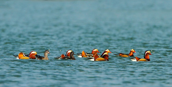 大寒时节,浙江省宁波市江北区荪湖吸引野生鸟类来此过冬,几只色彩艳丽的鸳鸯游弋在湖面。(浙江省宁波市江北区纪委监委供 沈国峰 摄)