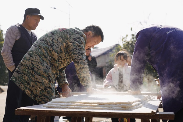 在浙江省永康市,村民们抢抓晴好天气将抽好的土索面拿出来晾晒,咸香味四溢。(浙江省永康市纪委监委供 胡华超 摄)