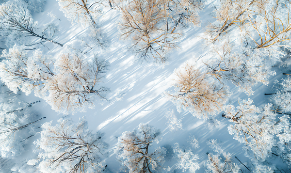 在黑龙江省伊春市的冰雪森林中,霜花挂满树枝,雪地泛着蓝光。从空中俯瞰,宛如童话世界般宁静、纯净。(黑龙江省伊春市纪委监委供 王龙 摄)