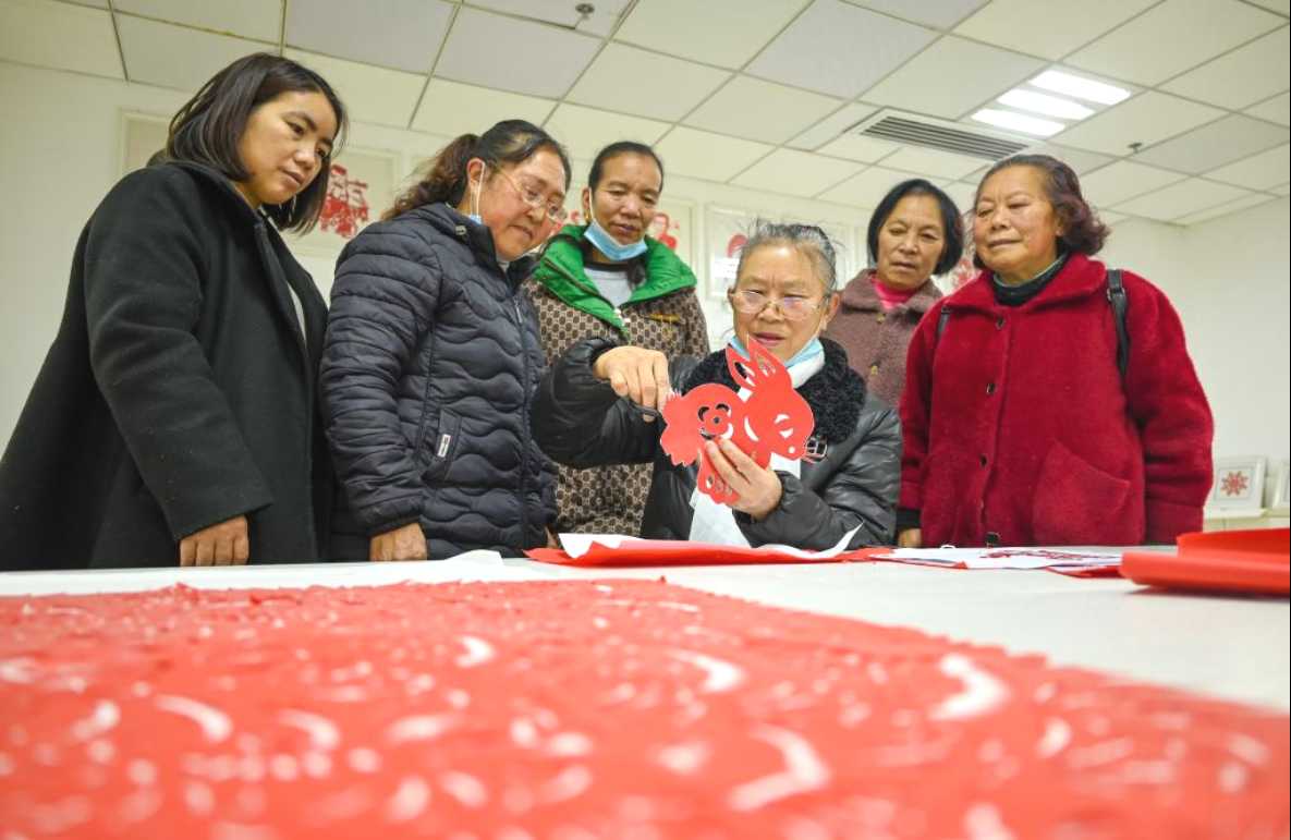遵义市新蒲新区纪检监察工委将廉洁文化与传统节日相融合,用“廉味”促“年味”,营造风清气正、欢乐祥和的节日氛围。图为社区居民一起创作兔年廉洁主题剪纸。(遵义市新蒲新区纪检监察工委供 简垦 摄)
