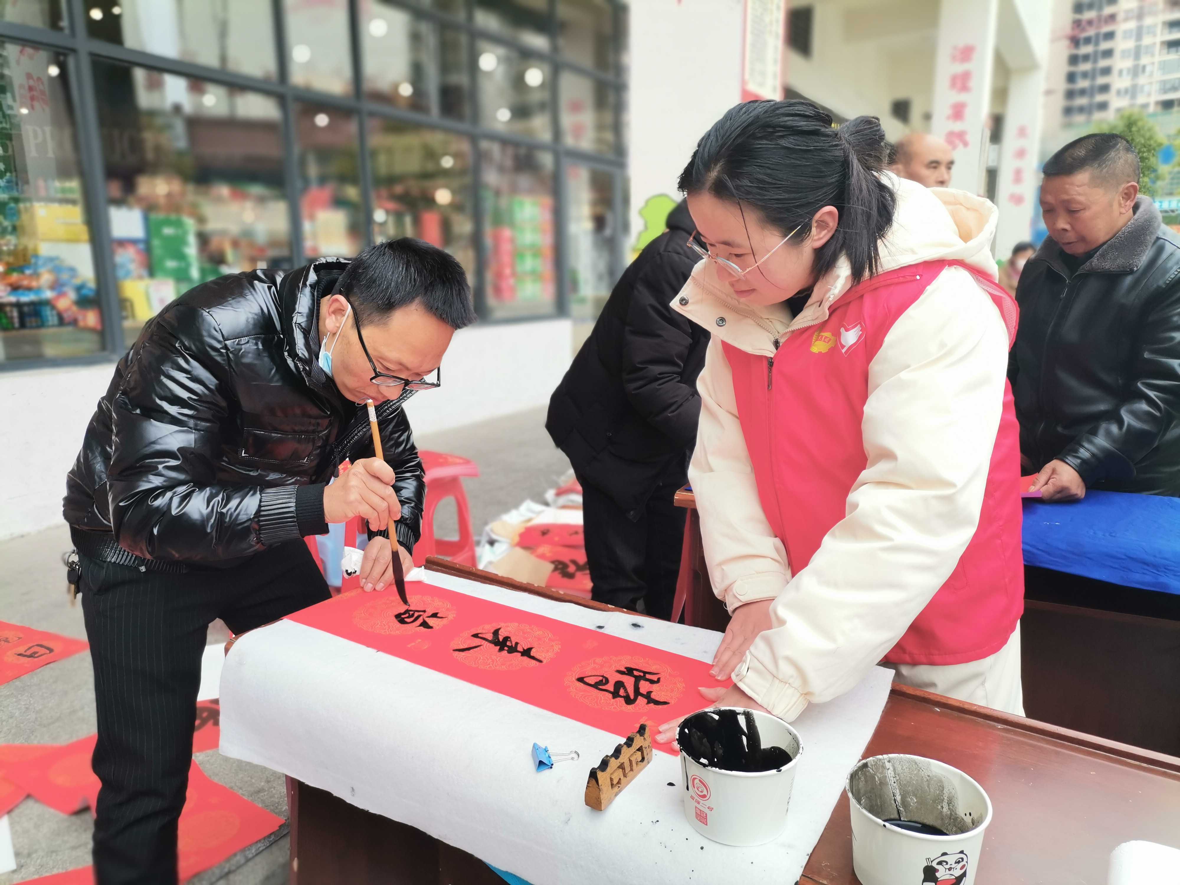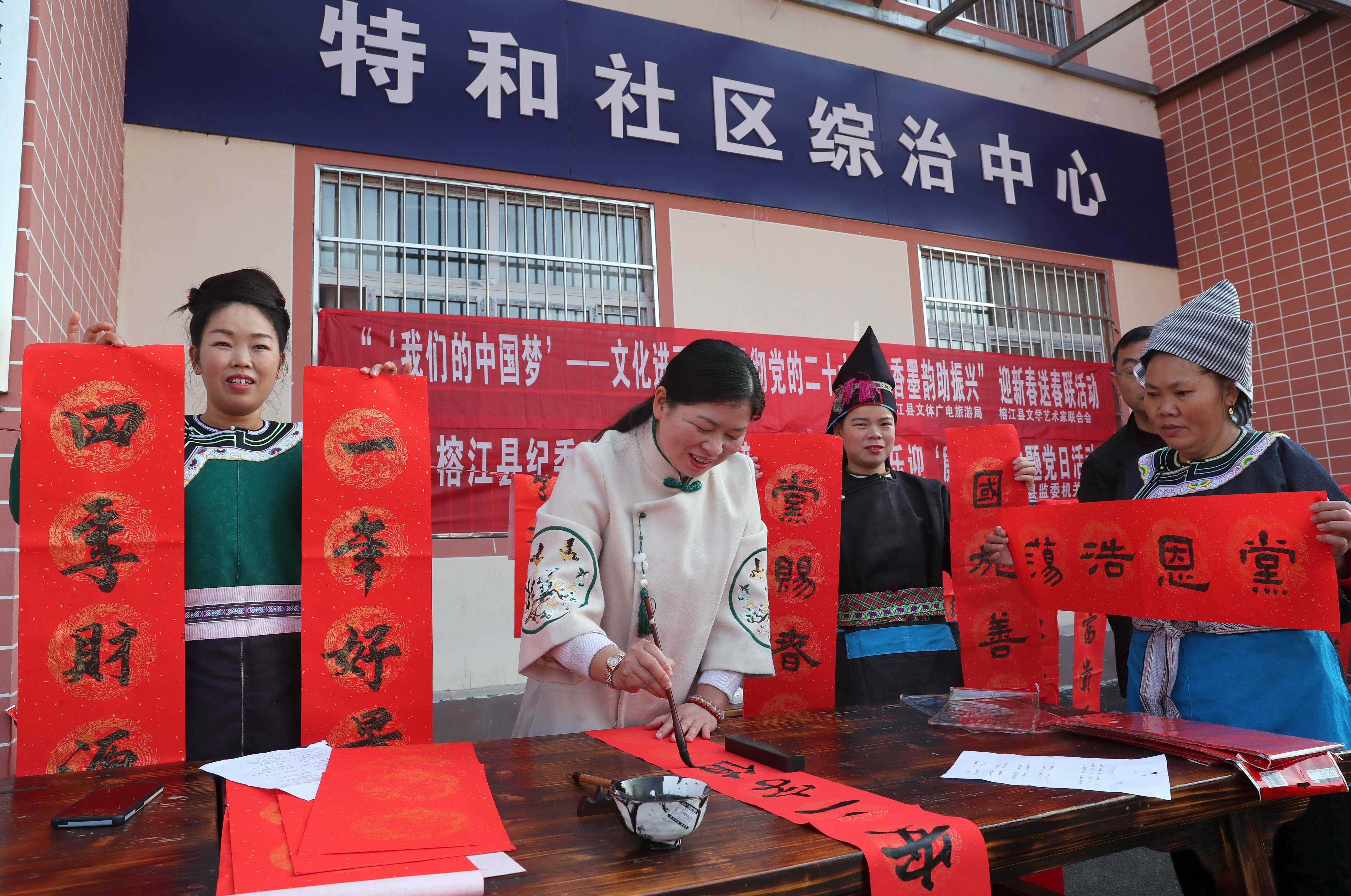 六盘水市盘州市纪委监委结合“送万福·进万家”书法公益活动,会同市书法家到乡镇(街道)为干部群众写廉洁春联、送“廉”到家。图为该市本土书法家在羊场乡为群众书写春联,送上新年祝福。(六盘水市盘州市纪委监委供 李应兰 摄)