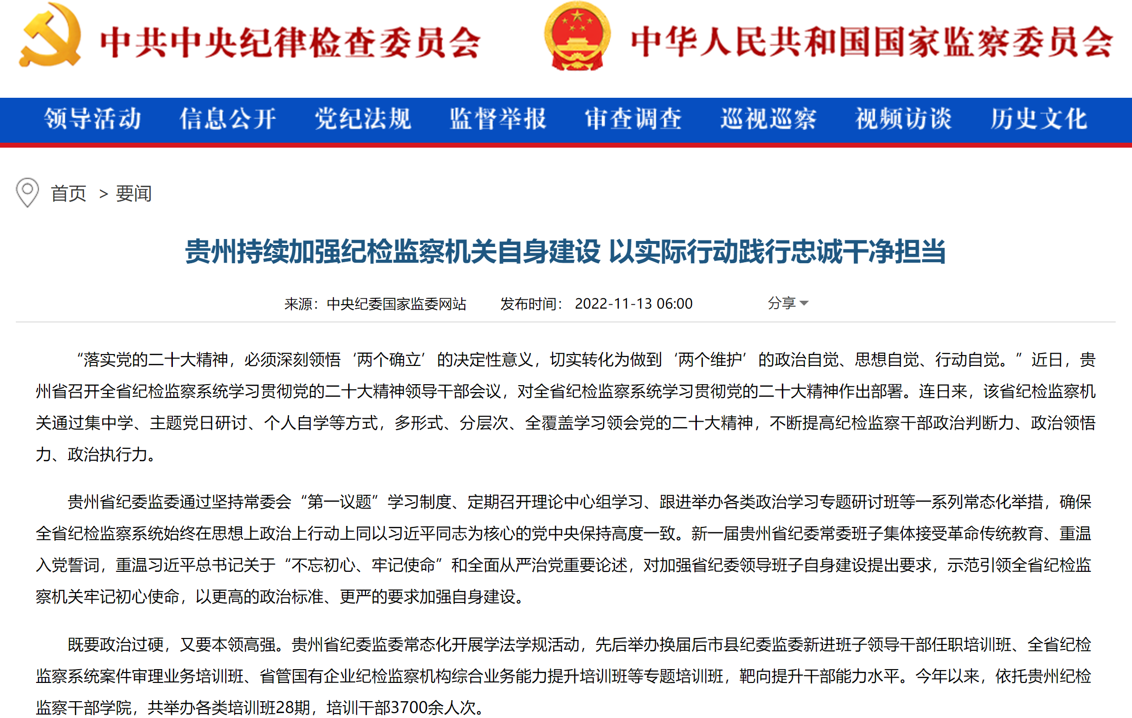 《中国纪检监察报》“新闻”版头条、中央纪委国家监委网站| 贵州持续加强纪检监察机关自身建设 以实际行动践行忠诚干净担当