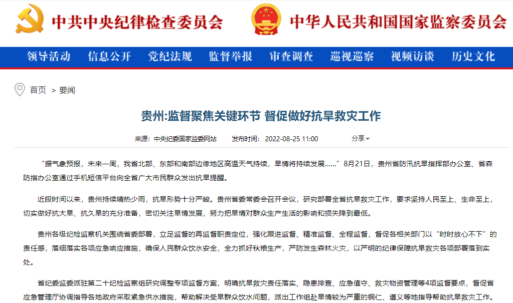 中央纪委国家监委网站|贵州:监督聚焦关键环节 督促做好抗旱救灾工作