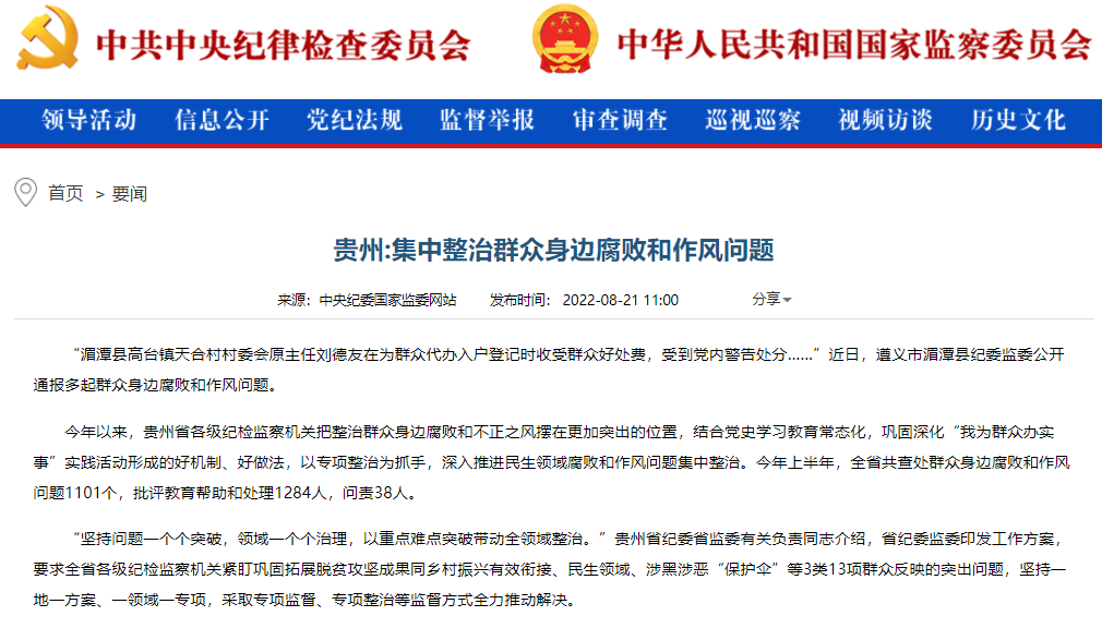 中央纪委国家监委网站 | 贵州:集中整治群众身边腐败和作风问题